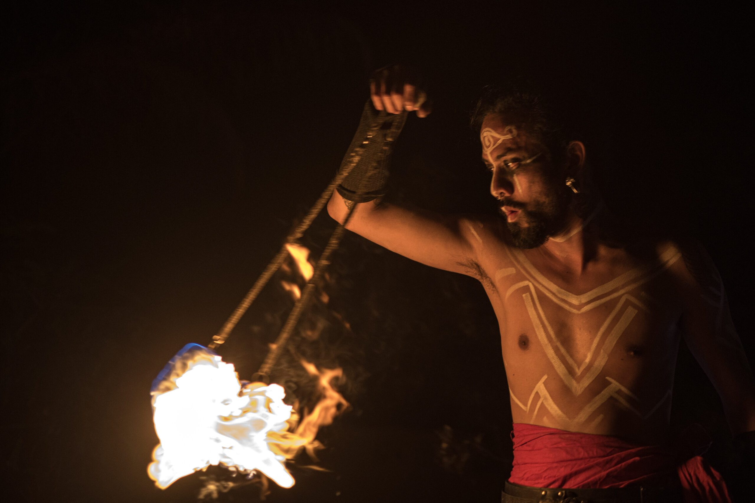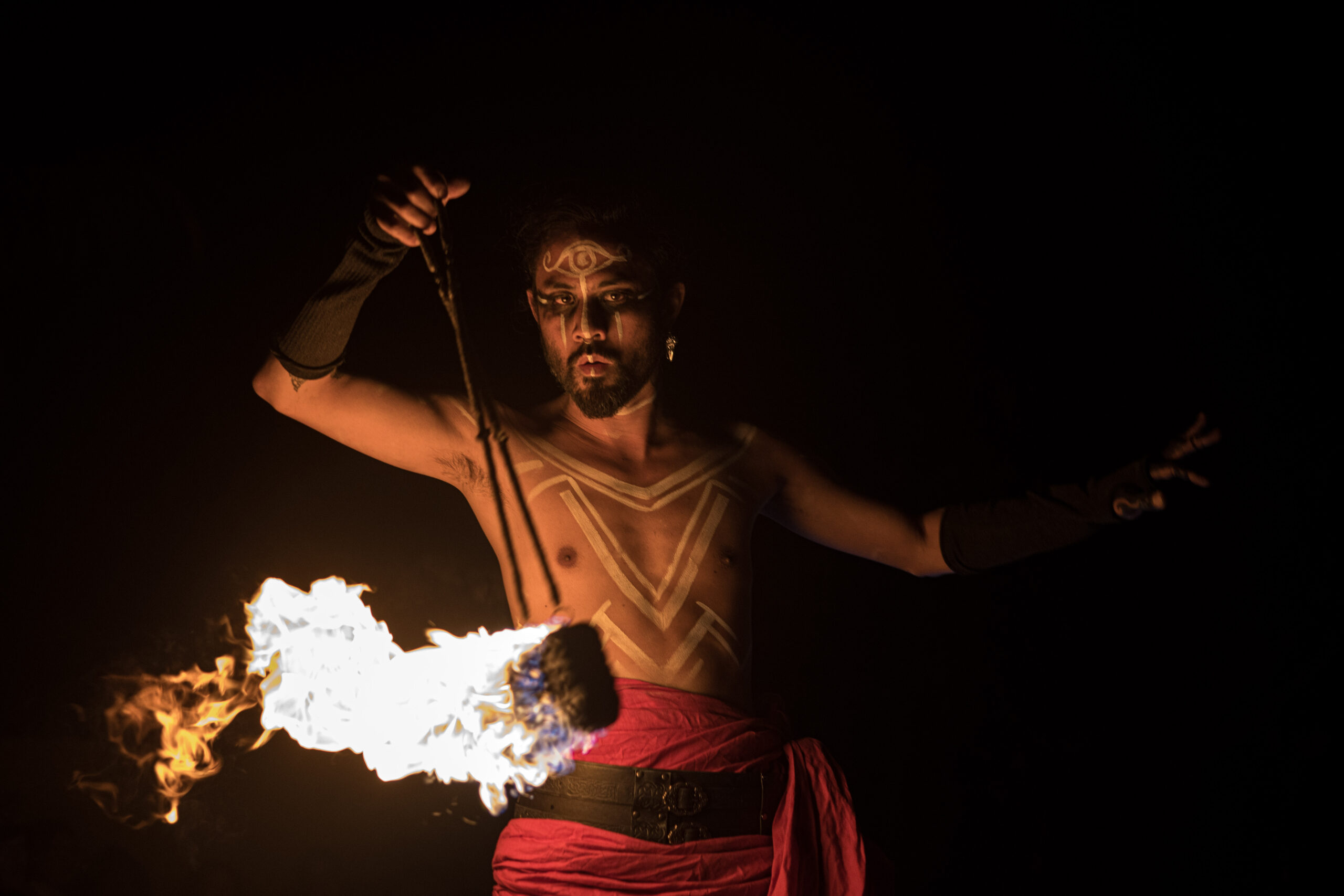 I’ve been performing with fire for two years, though my journey with flow arts began six years ago with poi. My fire act blends contact staff and poi into a progressive, dance-based performance rooted in tribal and mystic themes, with martial arts inspiration, storytelling, costume, and choreography.
